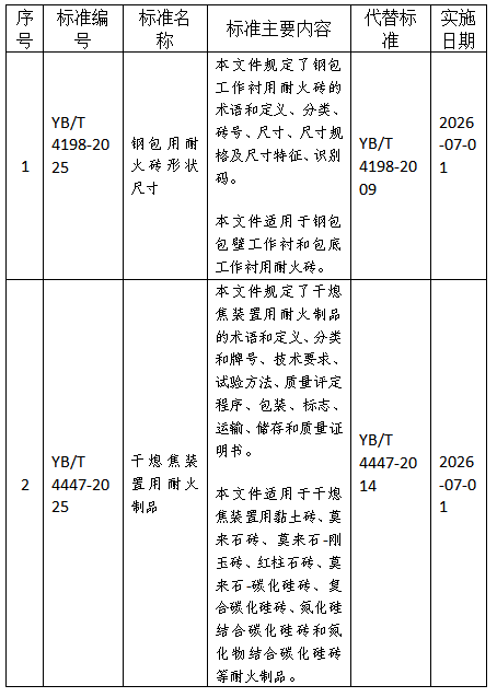 近日,工業(yè)和信息化部批準(zhǔn)發(fā)布《電動汽車運(yùn)行碳減排量評估方法》《個人信息保護(hù)術(shù)語》等748項(xiàng)行業(yè)標(biāo)準(zhǔn)。其中和耐火材料相關(guān)的行業(yè)標(biāo)準(zhǔn)有三項(xiàng):《鋼包用耐火磚形狀尺寸》《干熄焦裝置用耐火制品》和《鋯質(zhì)定徑水口》,實(shí)施日期為2026年7月1日,具體情況見下表。